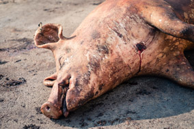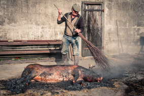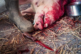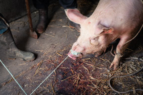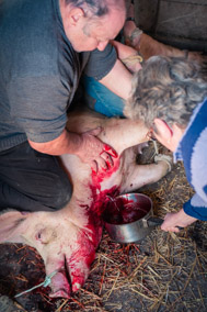 The pig is first rendered unconscious, typically by a blunt force to the back of the head. The animal is then exsanguinated (the blood being reserved for the making of Boudin), usually via the carotid artery and the jugular vein. After the blood is drained, the carcass is covered in straw and burnt to remove the hair before being meticulously cleaned. The body is then hoisted and eviscerated, the head is usually removed, and the body is cut into two halves. The halves are washed again to remove any remaining blood, bacteria or remains of bone.