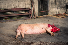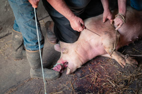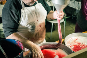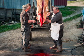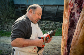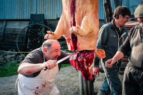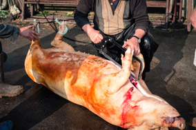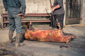 The pig slaughter in France traditionally takes place in the autumn and early winter, and the timing has practical considerations. It can start as soon as it gets cold, as the cold is required as a natural method of preserving the relatively large quantities of meat during the butchering.