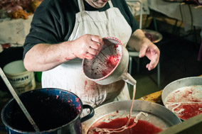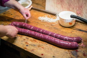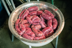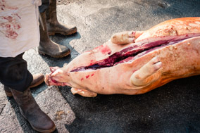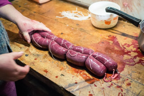 The meat will hang in an appropriate area (usually a spare barn) free of vermin or insects overnight to ‘rest’ and cool down in order to help with the process of cutting and deboning. Nearly all parts of the pig are reserved and used in some fashion. Aside from the prime cuts, the boutcher will produce a large quanity of sausages, boudin, paté, head cheese (pâté de tête), and rillettes from any scraps. The lard is reserved for use in cooking and flavoring dishes.