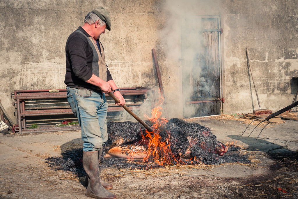 The pig is covered in clean straw, which is burnt to remove the hair.