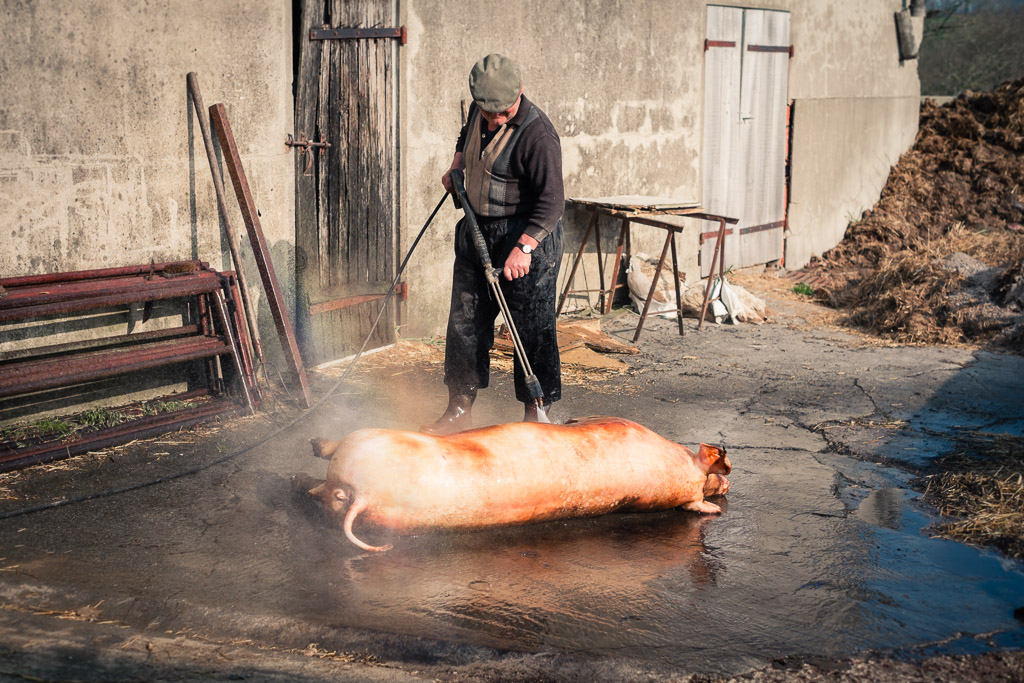 Washing the pig using a pressure washer to remove soot, blood and dirt. Copyright © 2014 Jason Langley