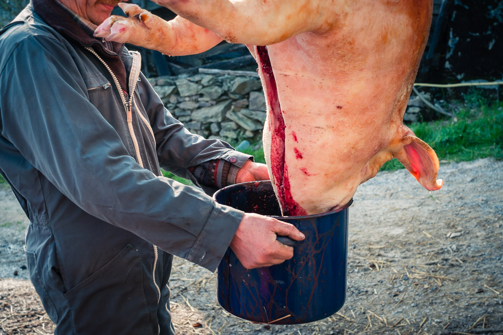 Catching the last of the blood in a pot as the pig is hoisted by tractor. Copyright © 2014 Jason Langley