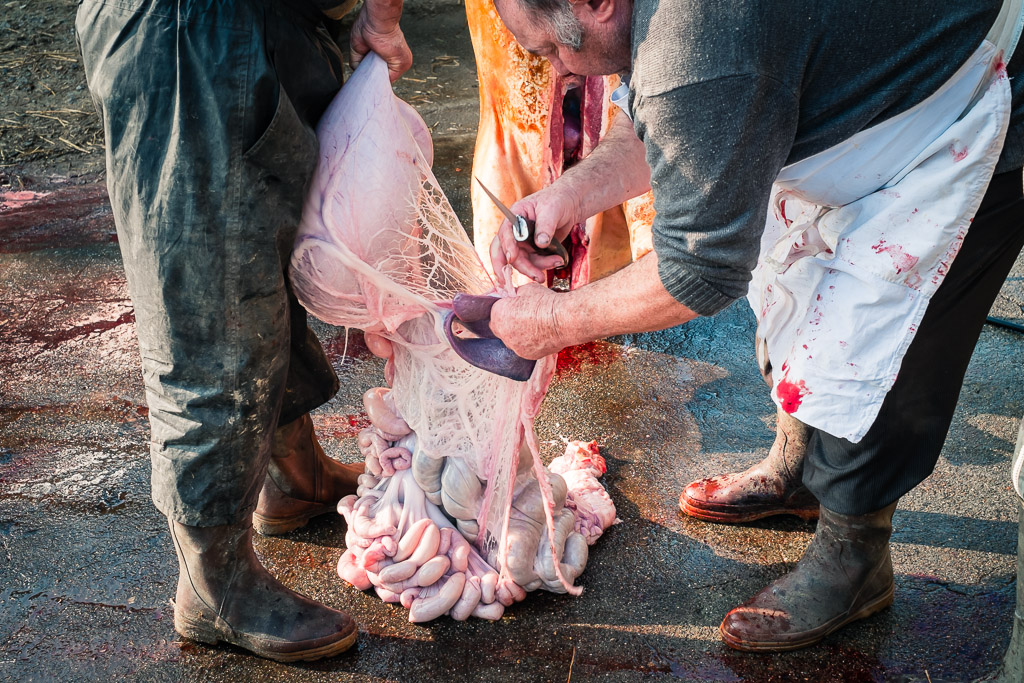 Removing intestines and recovering the Caul Fat (exterior stomach lining of the pig) which is used in making of paté. Copyright © 2014 Jason Langley