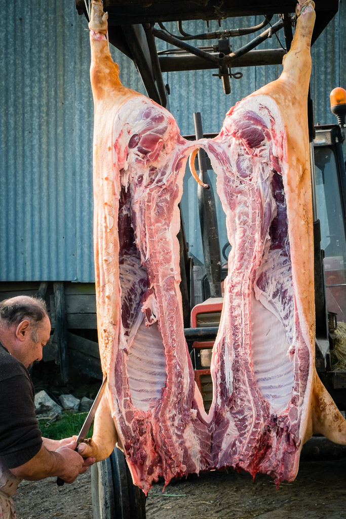 Two halves of a cleaned pig hoisted by tractor.