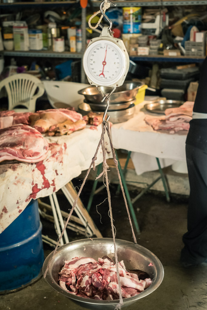 Weighing meat before grinding to make sausages.